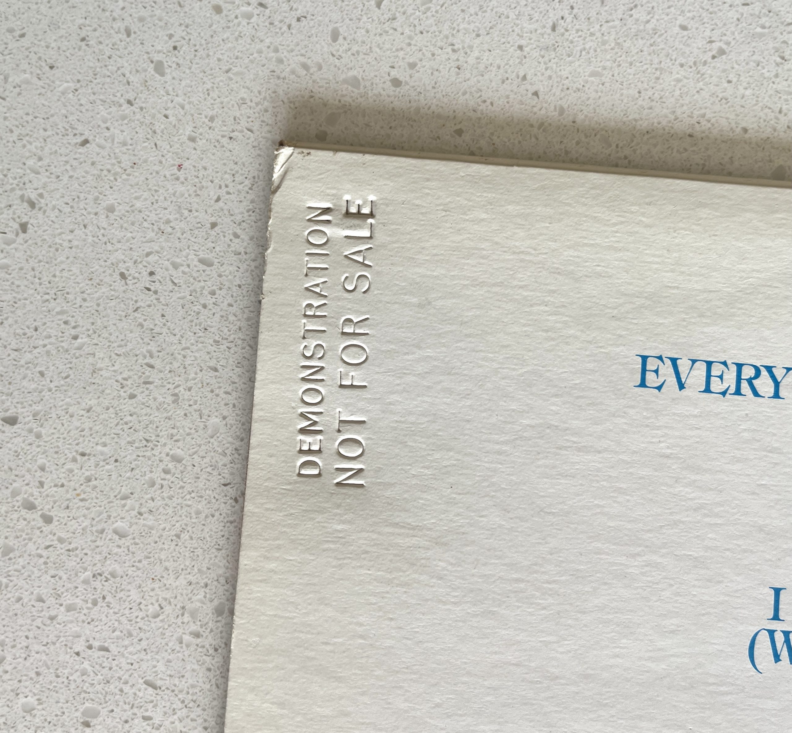 The sleeve has a stamped section on the back that says “Demonstration not for sale”, and this is slightly visible and mirrored on the front as well (see 2nd picture)